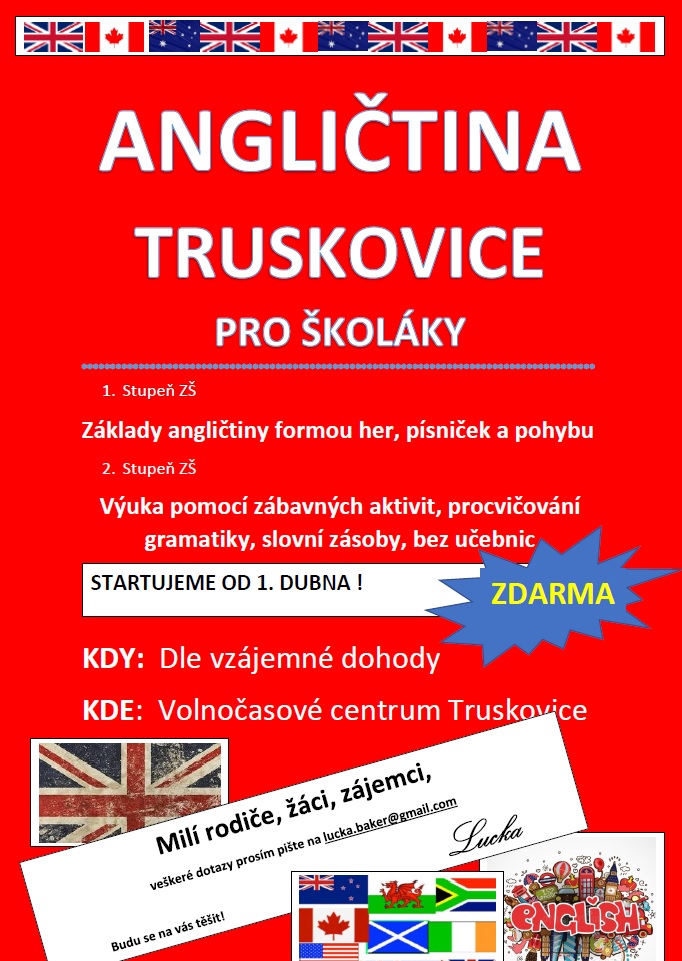 V Truskovicích začíná 1. dubna výuka angličtiny pro školáky 1.stupně a 2.stupně ZŠ. Angličtinu bude vyučovat Lucka Baker, která žila dlouhodobě v zahraničí. Lucka už se na všechny zájemce těší.